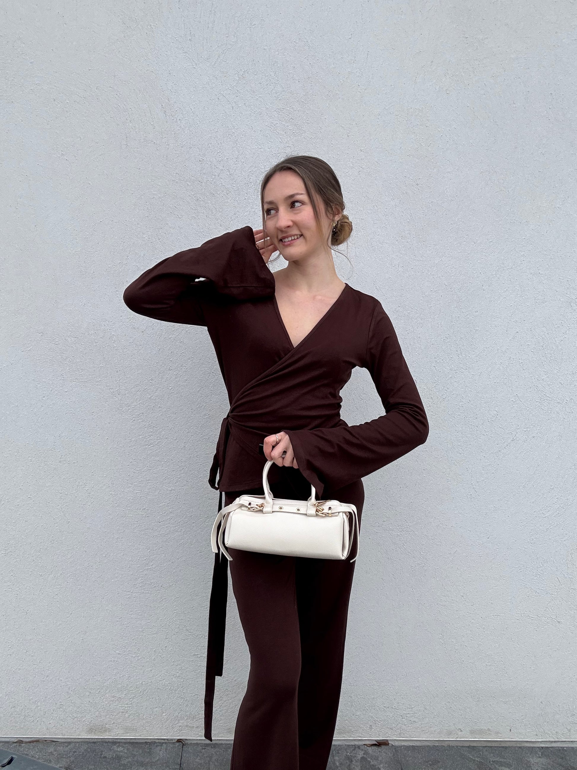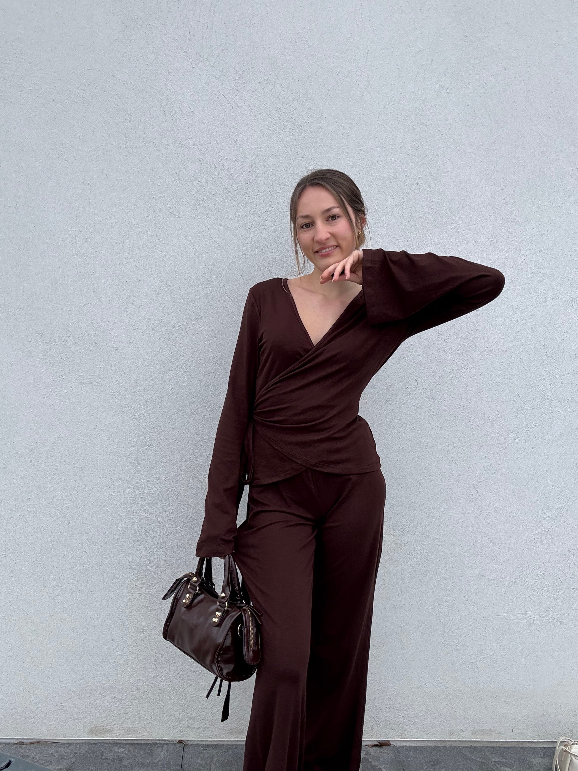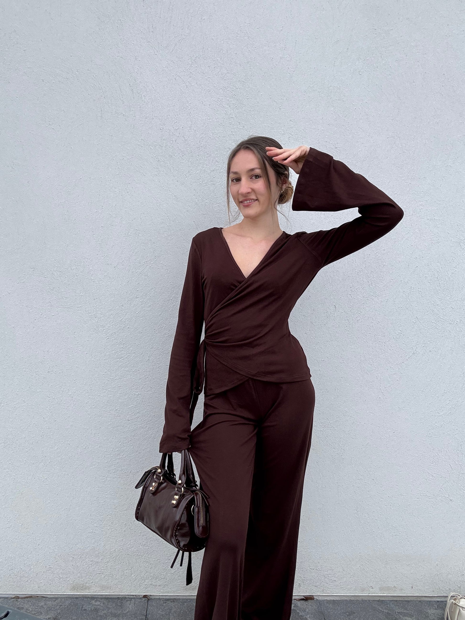 L’ensemble Élina allie confort et style. Le haut cache-cœur dispose d’un système de cordons ingénieux : un cordon passe à l’intérieur d’un petit trou sur le côté, pour ensuite faire le tour et se nouer selon votre envie, permettant d’ajuster parfaitement la taille et le décolleté. Le pantalon fluide et agréable à porter complète ce look élégant et moderne, idéal pour un style chic au quotidien ou pour une sortie casual.